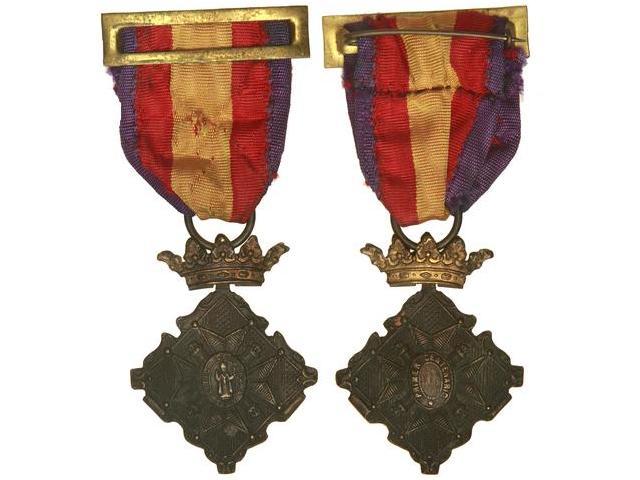 Centenario de Gerona en categoría de Bronce. 1910. Anv.: Escudo de Catalunya, sobre él Distinción del Sitio de Gerona. Rev.: Igual que el anverso, pero leyenda PRIMER CENTENARIO. Br. Ø 33x43 mm. Corona, anilla y prendedor originales. Cinta confeccionada artesanalmente de época. PG-791b. MBC+.