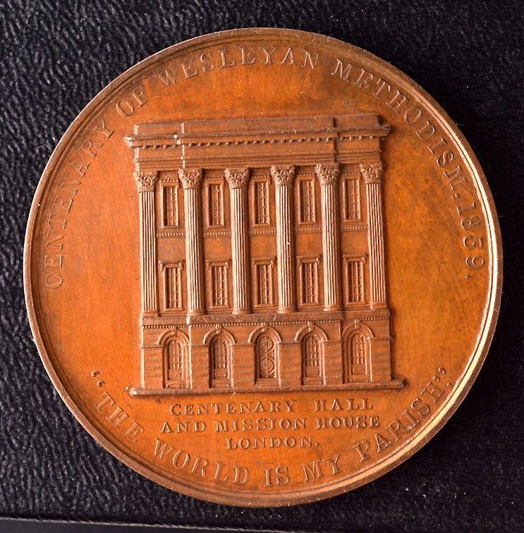 Obv: Draped bust, left; "John Wesley, M.A. Born At Epworth, June 17th, 1703, Died In London, March 2nd, 1791"; Rev: Façade at centre; "Centenary Of Wesleyan Methodism, 1839", "The World Is My Parish", "Centenary Hall And Mission House, London" in exergue; Ae, 49mm, smaller size, BHM-1895, Eimer-1329b, by C.F. Carter, EF, nice colour.
