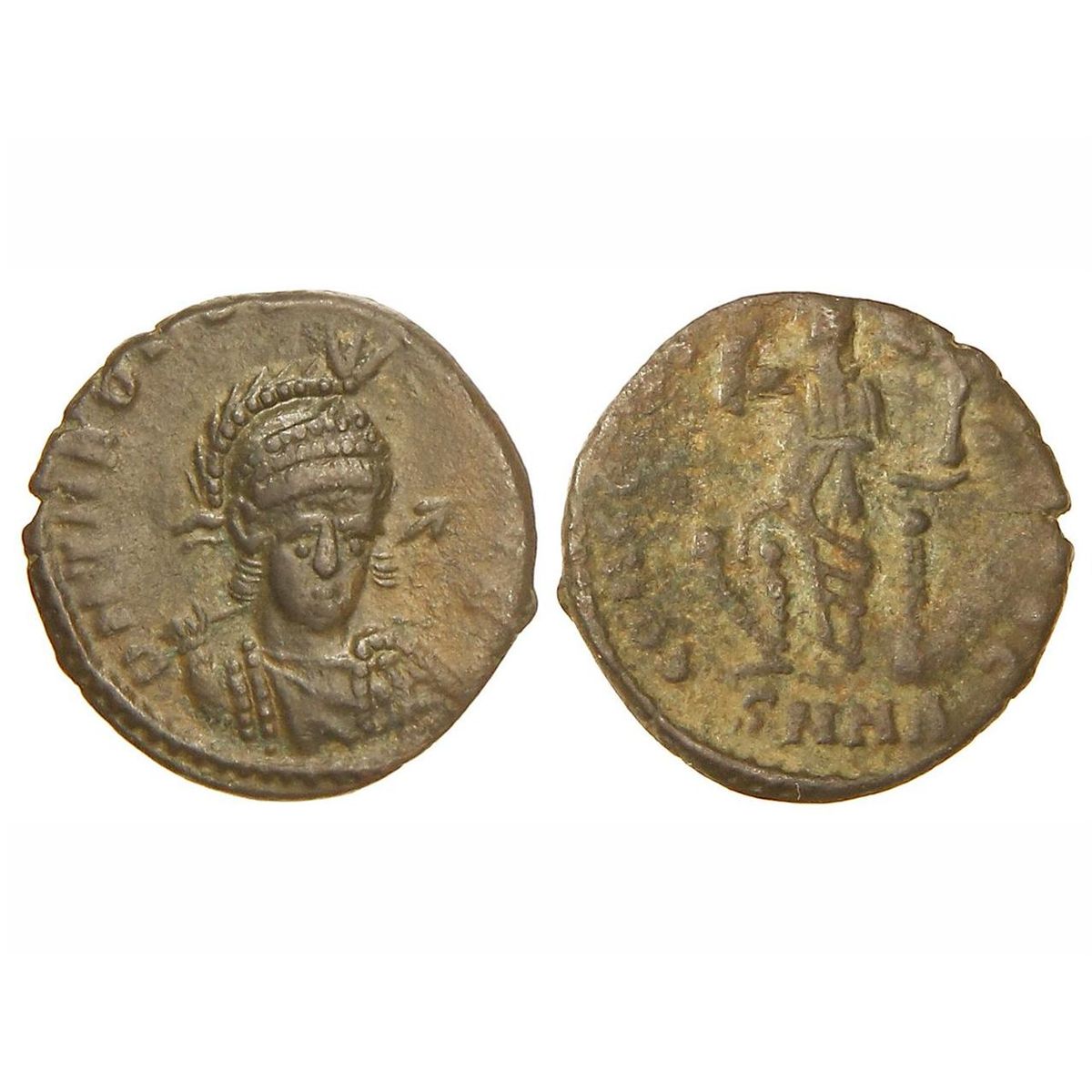 Centenional. - 408-450 d.C. - TEODOSIO II. - Rev.: CONCOR(DIA AVGG) SNMA. Constantinopla sentada de frente con lanza y Victoria. 2,40 grs. AE. Pátina oscura. S-25. MBC. - -