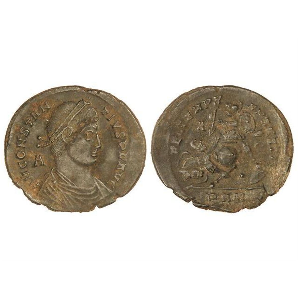 Centenional. - Acuñada el 348-349 d.C. - CONSTANCIO II. - Rev.: FEL. TEMP. REPARATIO. PAR. Soldado a izquierda alanceando a un jinete caído. 4,40 grs. AE. Pátina verde. C-44. EBC-/MBC+. - -