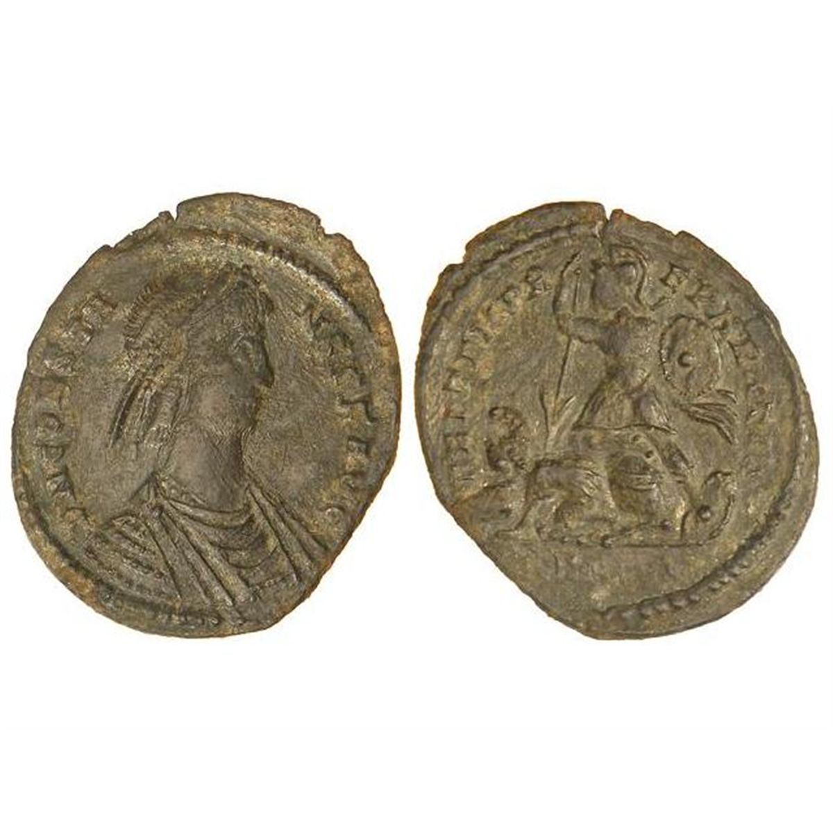 Centenional. - Acuñada el 348-350 d.C. - CONSTANTE I. - Rev.: FEL. TEMP. REPARATIO. Soldado a izquierda alanceando a jinete derribado. 3,90 grs. AE. Pátina verde. C-17. MBC+. - -