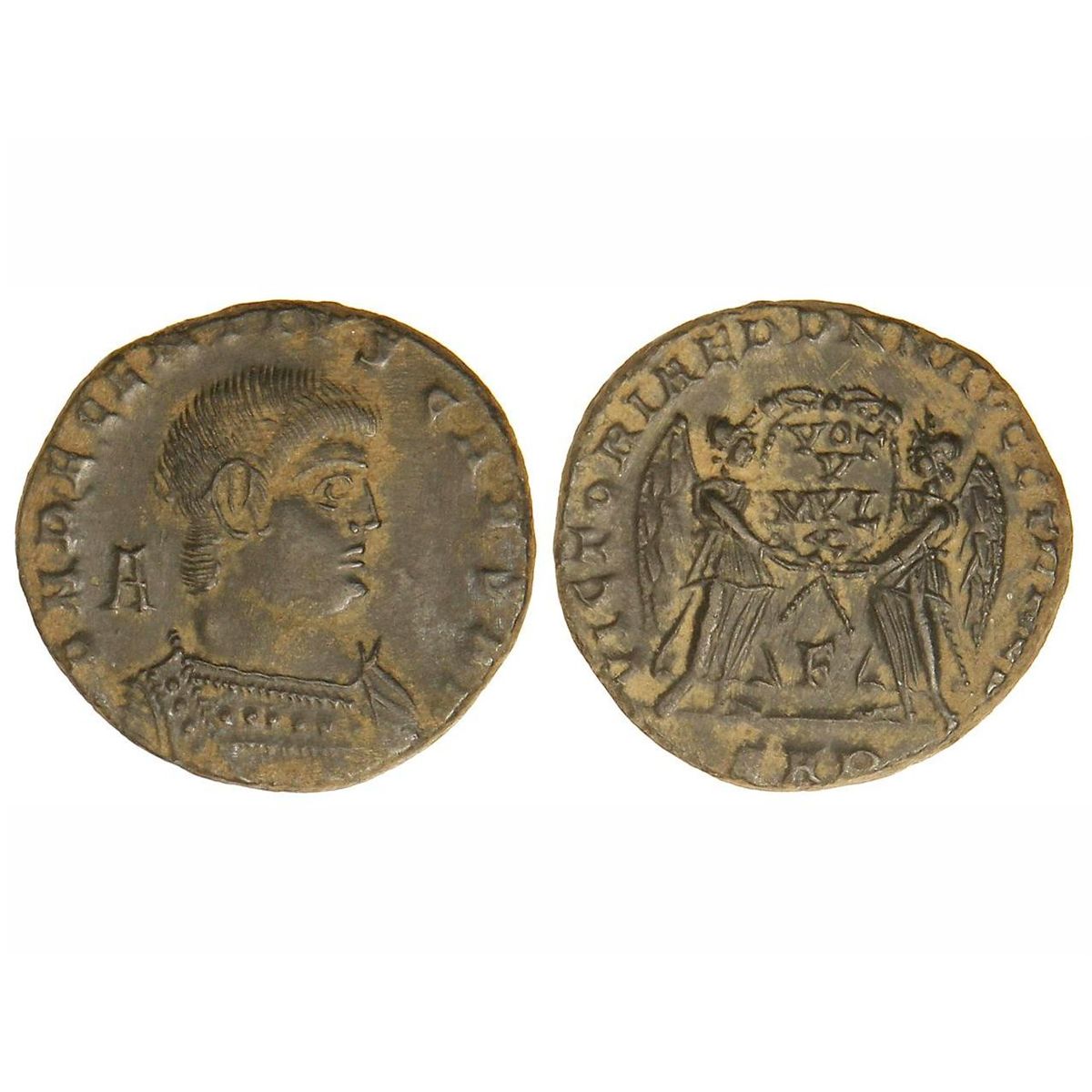 Centenional. - Acuñada el 351-353 d.C. - DECENCIO. - Rev.: VICTORIAE DD. NN. AVg. (ET CAES.) SA(R.). Dos Victorias en pie con un escudo con la inscripción VOT. V. MVLT. X, debajo F. 4,50 grs. AE. Pátina verde. C-43 var. EBC-. - -