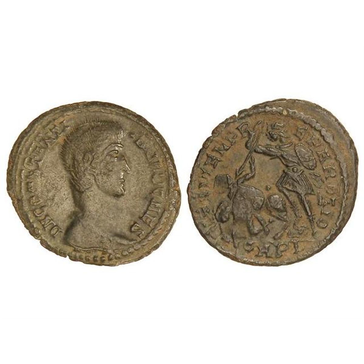 Centenional. - Acuñada el 351-354 d.C. - CONSTANCIO GALO. - Rev.: FEL. TEMP. REPARATIO. APL. Soldado en marcha a izquierda alanceando a un jinete caído. 3,40 grs. AE. Pátina verde oscura. C-17. EBC-. - -