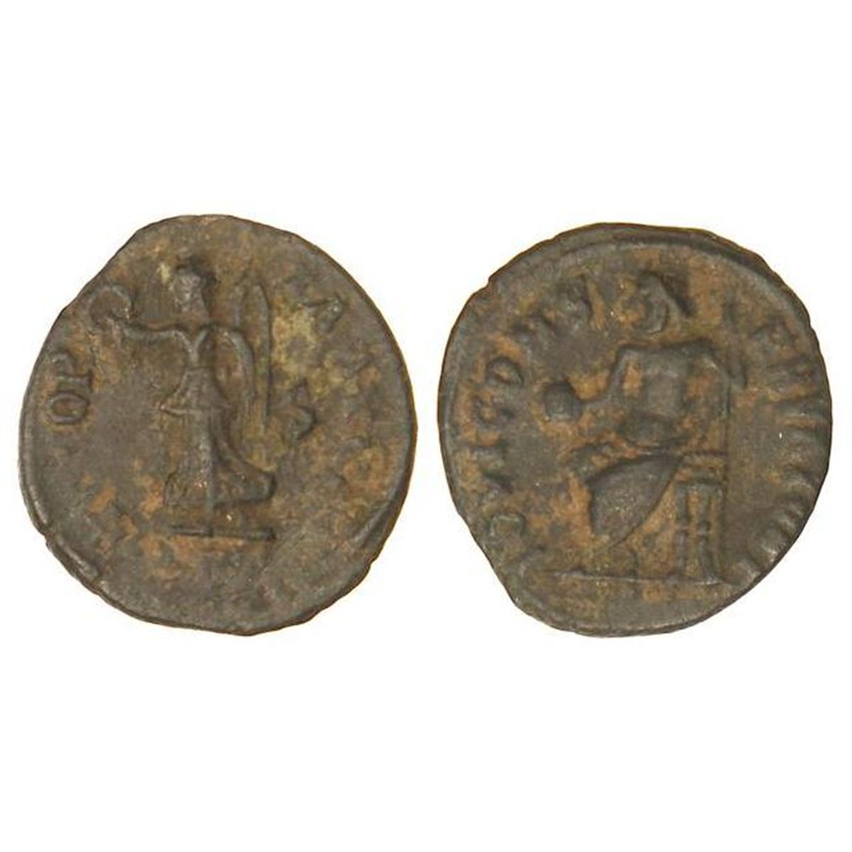¿Centenional? -. Acuñada el 360-363 d.C. - JULIANO EL APOSTATA. - Anv.: IOVI CONSERVATORI. Júpiter sedente a izquierda con globo y cetro. Rev.: VICTORIA AVGG. Victoria en marcha a izquierda. RARA. C-53. MBC. - -