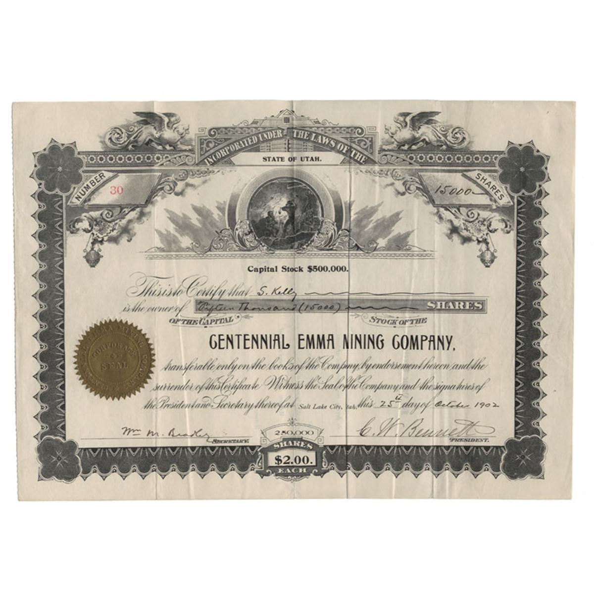 1902, Utah. Stock certificate for 15,000 shares. Black with attached embossed gold company seal. Small vignette at top center of miners at work. Folds. Uncancelled and fine.