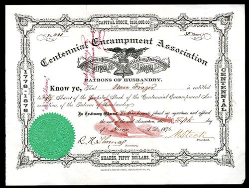 Pennsylvania, 1876, 50 Shares, Issued Stock, black on black border and underprint, Bald Eagle with American flag perched atop Liberty Bell top center, VF-XF condition, Farmers Friend Print. Issued for the Centennial Anniversary of the Declaration of Independence.