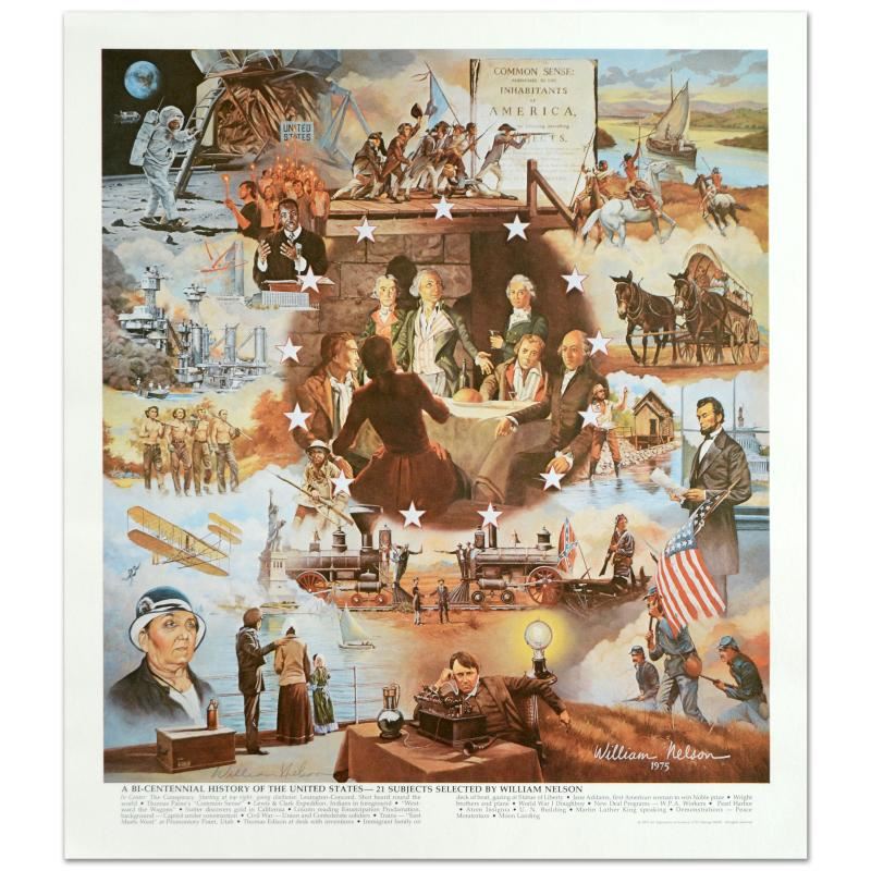 "Centennial History of U.S." is a lithograph on paper by William Nelson, hand signed by the artist! Measures approx. 18.5" x 21.5" (with border); 16.5" x 18.5" (image). Please allow 5 additional business for items that include canvas stretch or framing.