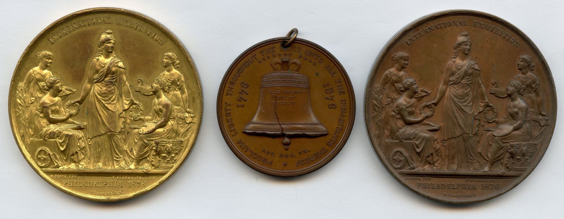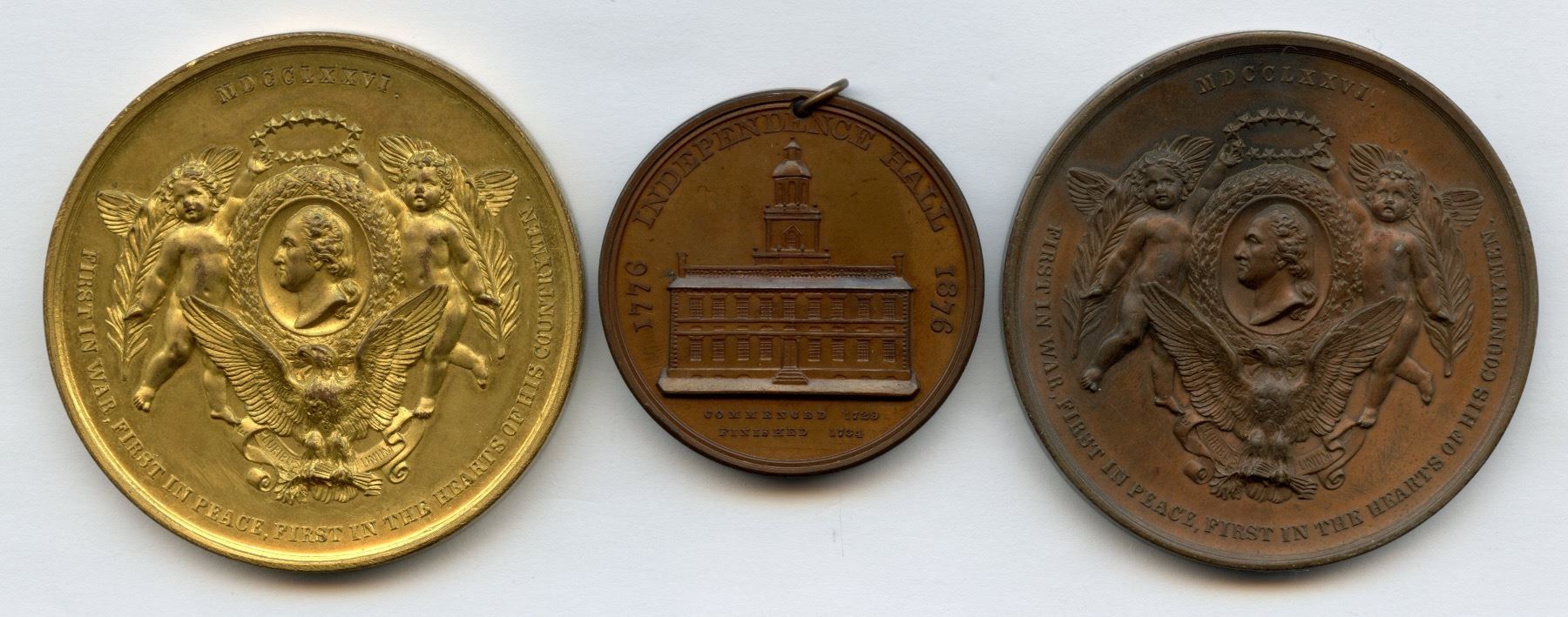 1.) 1876 Independence Hall centennial medal in bronzed copper. 2.) 1876 Philadelphia Exhibition Washington Medal (Danish) in gilt bronze. 53mm. GW-932. 3.) As last, in copper. Superb lot. 3 pcs.