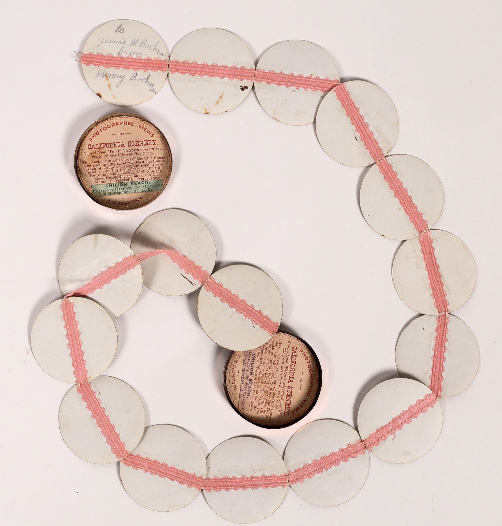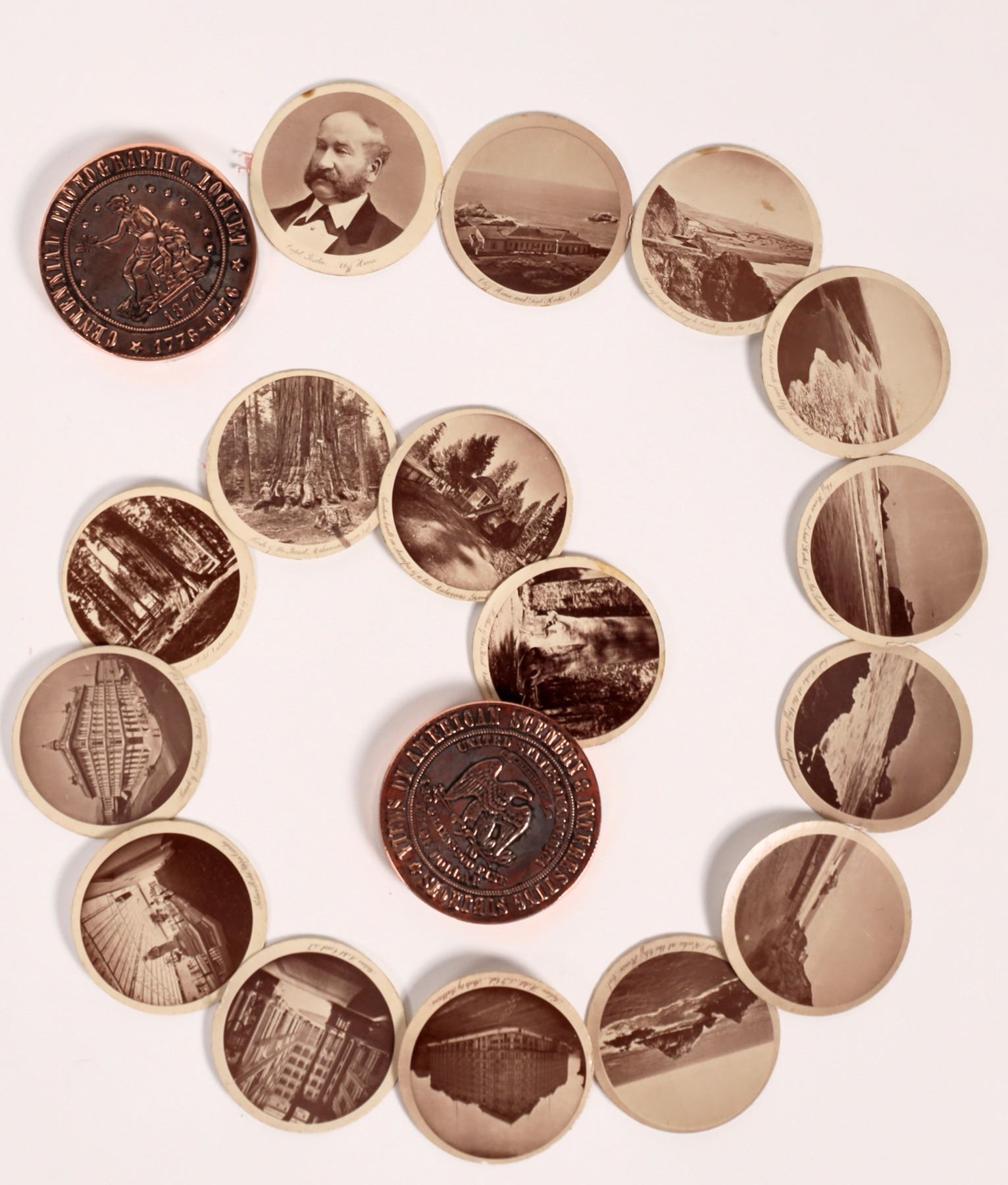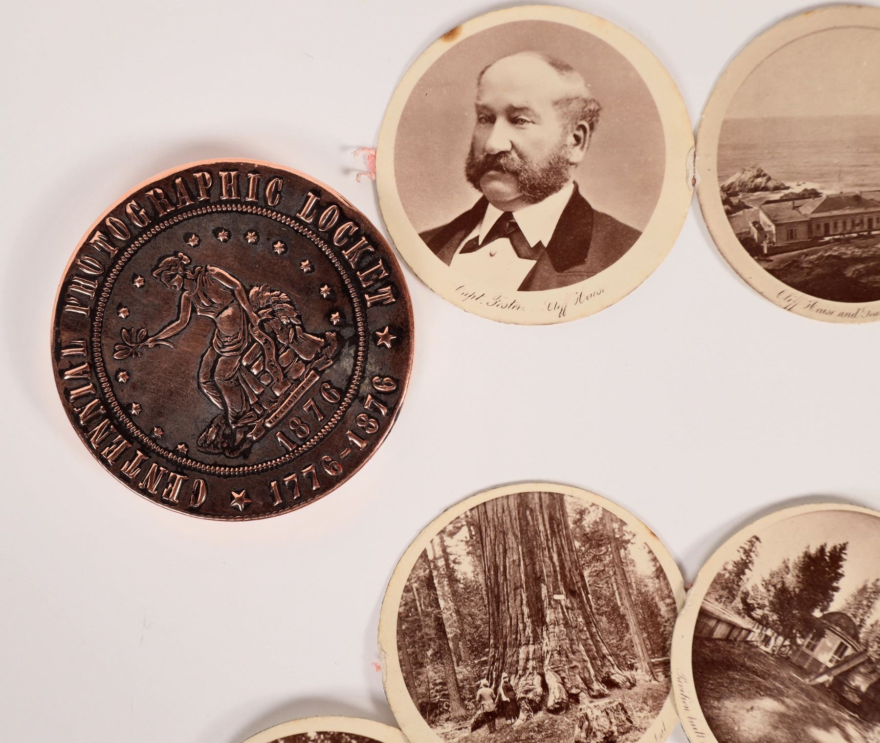 Extremely rare photo locket showing 16 round black & white photos (2") of the west coast of California in and around 1876. Photos are of Cliff House, The Palace Hotel, Big Trees, Nevada Bank and more. Photos are very clear and still attached by a ribbon. All are enclosed in a small copper-like case. Please see photos for more details.