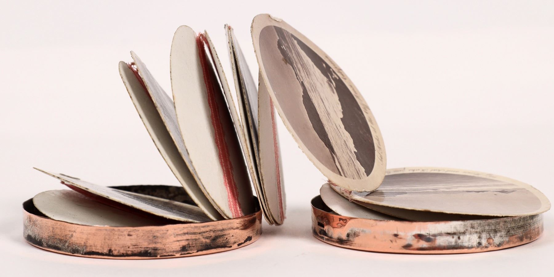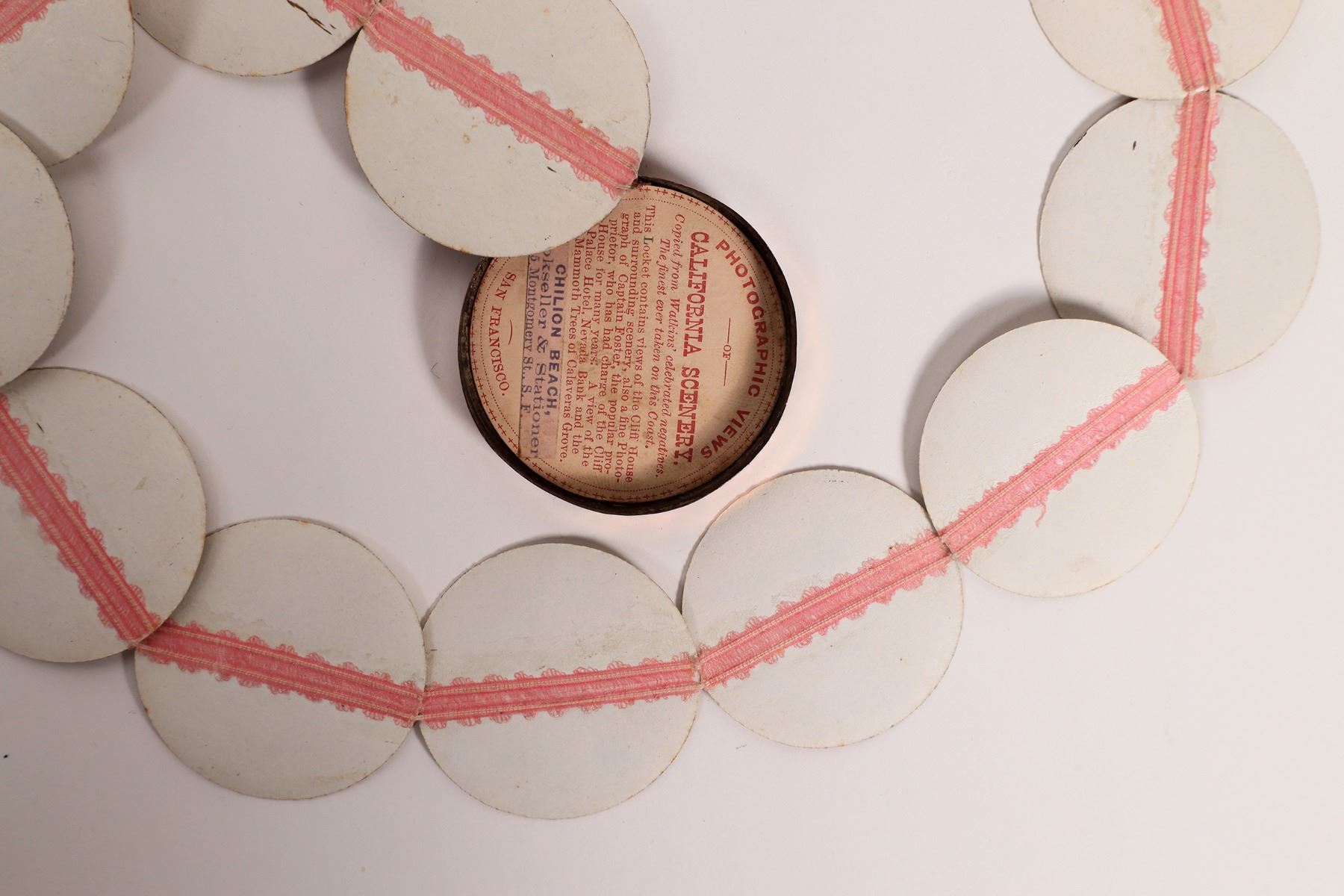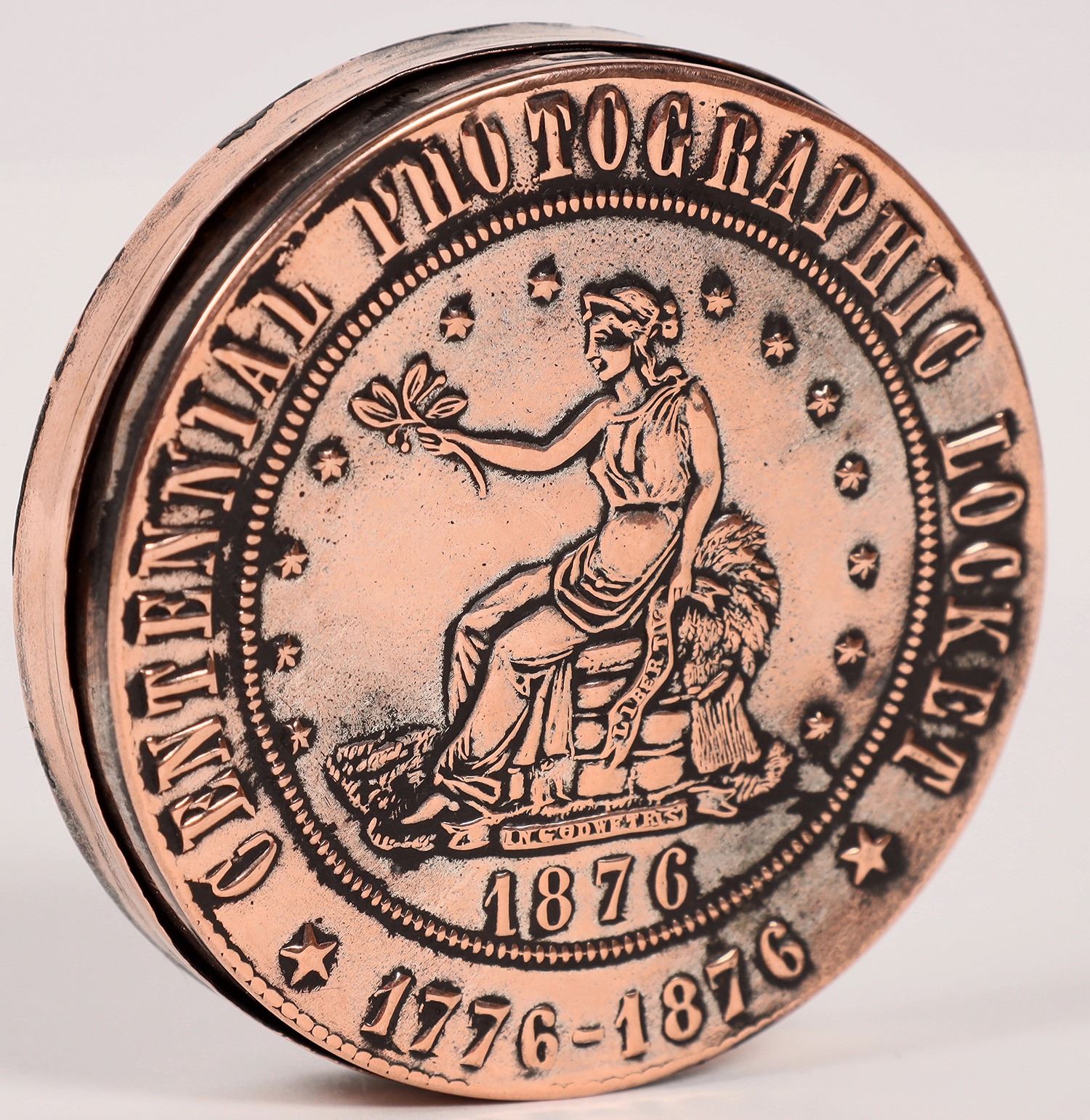 Extremely rare photo locket showing 16 round black & white photos (2") of the west coast of California in and around 1876. Photos are of Cliff House, The Palace Hotel, Big Trees, Nevada Bank and more. Photos are very clear and still attached by a ribbon. All are enclosed in a small copper-like case. Please see photos for more details.