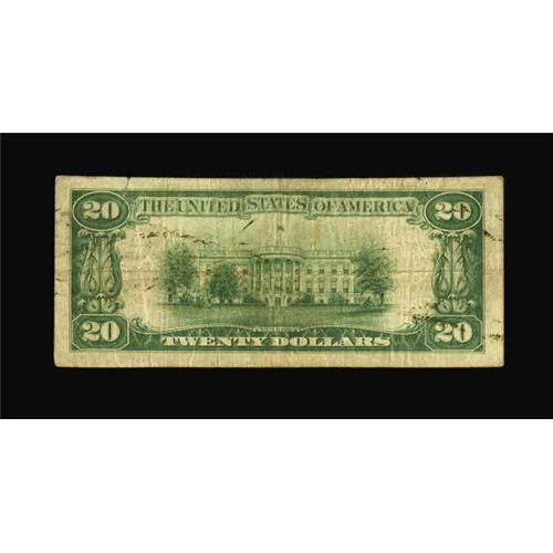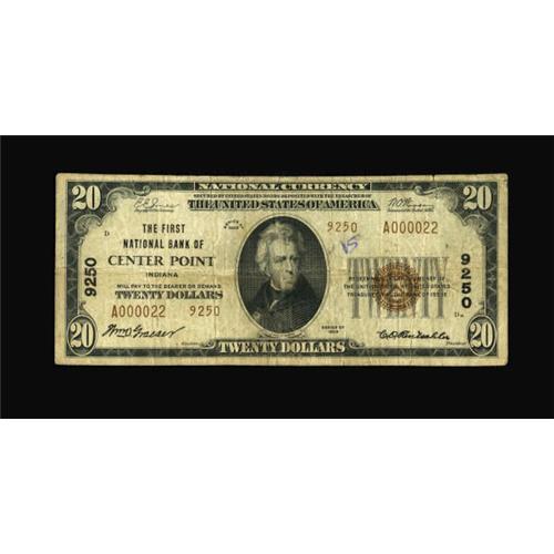 <B>Center Point, IN</B></I> - $20 1929 Ty. 2 <B>The First NB</B></I> Ch. # 9250<BR> A tougher note from the only bank in town to issue. <B>Fine,</B></I> with a small split and a written number on the face. This example is the only Type 2 twenty reported from here to date. <BR><BR><b>Shipping:</b> Coins & Currency (<a target="_blank" href="http://www.heritageauctions.com/common/shipping.php">view shipping information</a>)