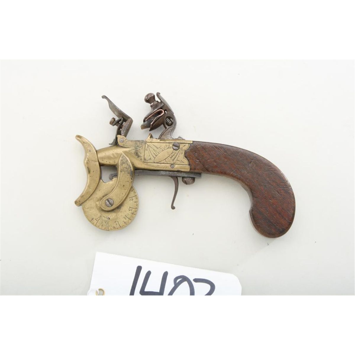 Center-hammer flintlock powder-tester similar in design to a pocket pistol of the early 1800 era. Brass body, bag shaped wood grip. The frame is engraved with stands of arms, the wheel shows hand-engraved graduations.The condition is good to very good, definitely British made. From the Keith Coulter collection. Est: $500 - $1,000