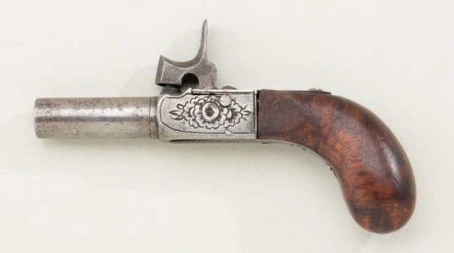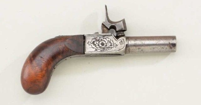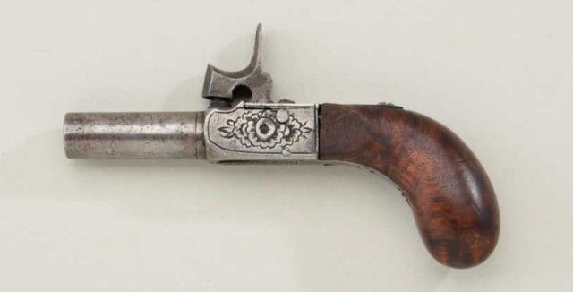 Center hammer percussion muff-pistol of diminutive size circa about 1850, probably French. The pistol shows no makers name or proofs and is numbered “9”. The pistol measures 4-1/4” overall with 1-1/4” barrel of 31 caliber. The hammer activates a folding trigger condition is good with sharp engraving and very good wood. From an old N.Y. collector’s estate. Est.;$300-$600.