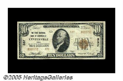 <B>Centerville, IA</B></I> - $10 1929 Ty. 2 <B>The First NB</B></I> Ch. # 337<BR>A solid and problem-free <B>Very Fine</B></I> from the only bank in town to issue the Type 2 $10.
