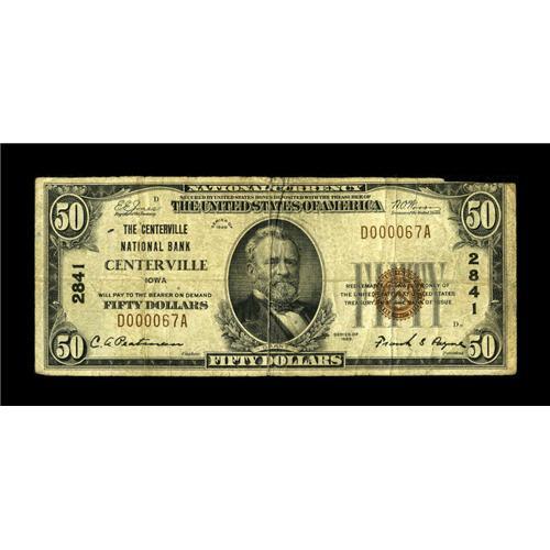 <B>Centerville, IA</B></I> - $50 1929 Ty. 1 <B>The Centerville NB</B></I> Ch. # 2841<BR>A very scarce high denomination example from this none too common bank. <B>Very Good-Fine,</B></I> trimmed in a bit at the top right.<BR><BR><b>Shipping:</b> Coin/Currency (<a target="_blank" href="http://www.heritageauctions.com/common/shipping.php">view shipping information</a>)
