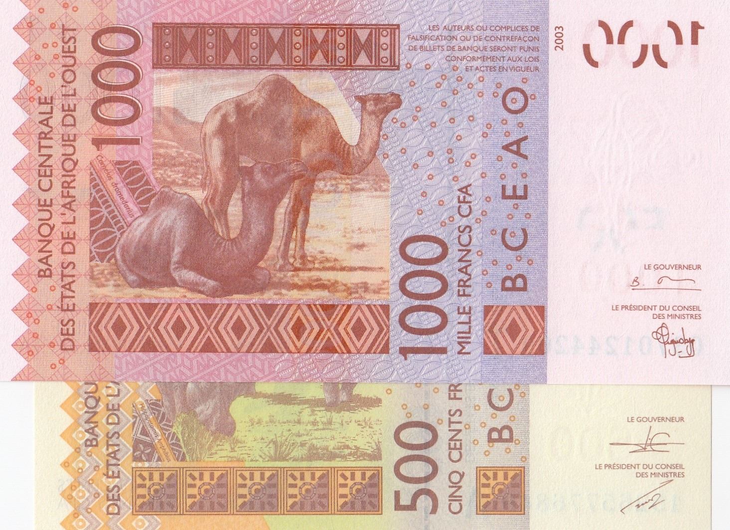 Central African States, 500 Francs and 1.000 Francs,2003/2012, UNC, p815T, p119A, (Total 2 bankotes)br/serial numbers: 15265776849 and 03701244209