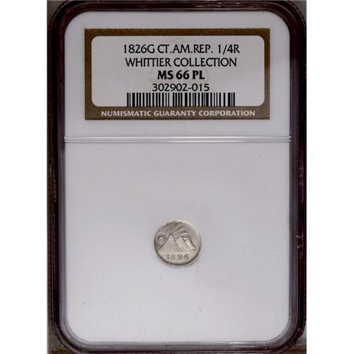 <B>Central American Republic 1/4 Real 1826G, </B></I>KM1, MS66 NGC Prooflike, a superb little coin with sparkling, mirror-like surfaces and full mint brilliance. The details are also extremely well-defined with every leaf in the tree clearly visible.