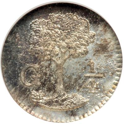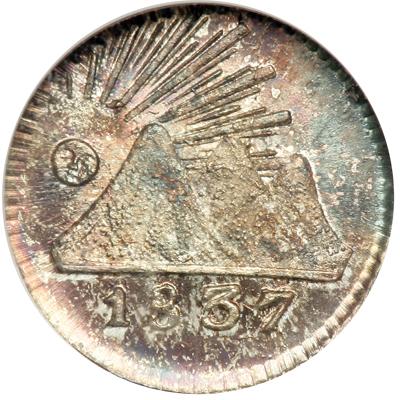 Central American Republic. ¼ Real, 1837-G. KM-1. Sun over mountain range. Reverse: Tree. Sharply struck with gorgeous iridescent toning. NGC graded MS-67.
