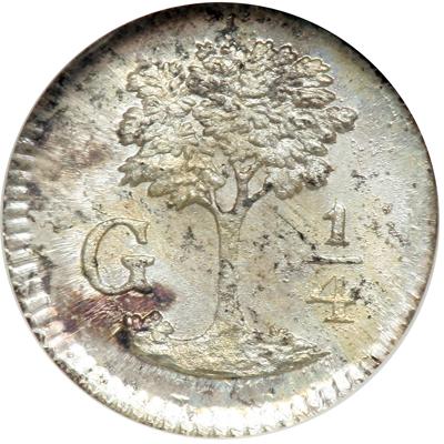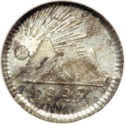 Central American Republic. ¼ Real, 1842/39-G. KM-1. Sun over mountain range. Reverse: Tree. Sharply struck and lustrous. NGC graded MS-66.