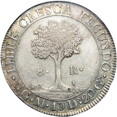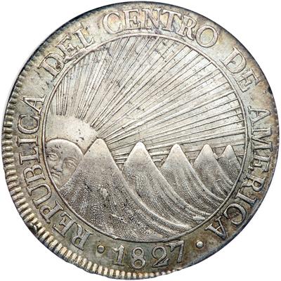 Central American Republic. 8 Reales, 1827-NG M. KM-4; Eliz-87. Sun rising behind mountain range. Reverse: Tree. Toned. NGC graded AU-58.