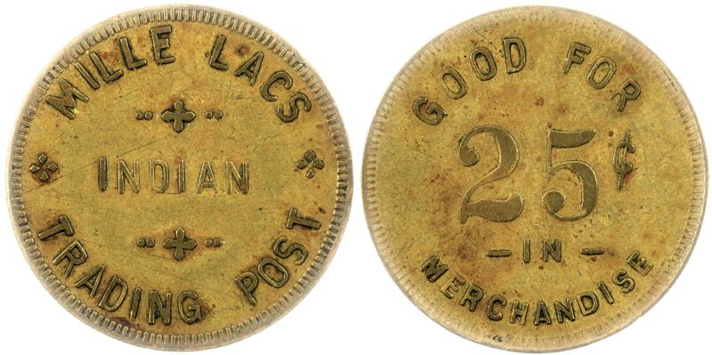 Obverse: Mille Lacs/ Indian / Trading Post; Reverse: Good For / 25c / in / Merchandise. Very fine condition.
