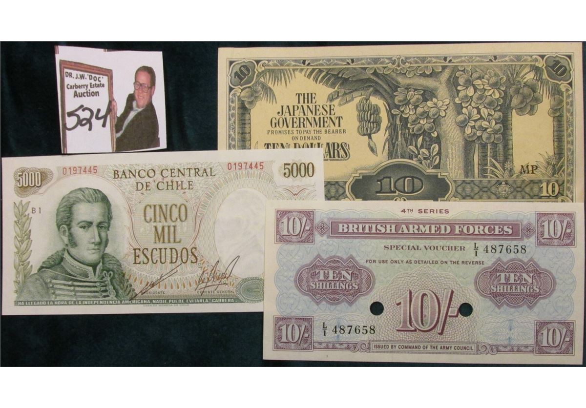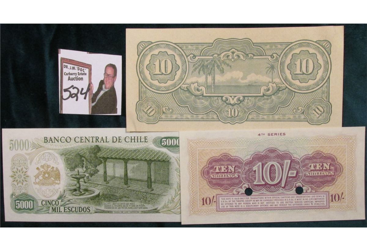 Central Banco Central Bank Chile 5000 Escudos; 4th Series British Armed Forces Ten Shilling Issued by Command of the Army Council, hole cancelled, CU; & Japanese Occupation of Malaya Banknote, WW II era, AU.