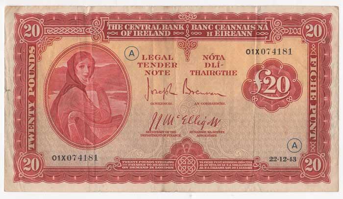 "War Code" issue, 22-12-43 (A), O1X 074181, small tear on left side, XMAS 1947 written in ink on the left hand side on the back, E-114, good fine. rare.