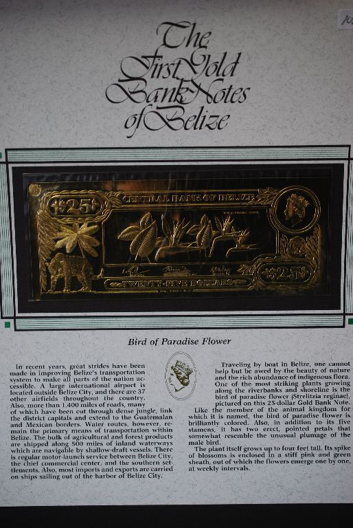 Central Bank Of Belize $25 Foreign Bank Note; "Bird Of Paradise Flower"; The First Gold Bank Notes Of Belize; EST. $5-10