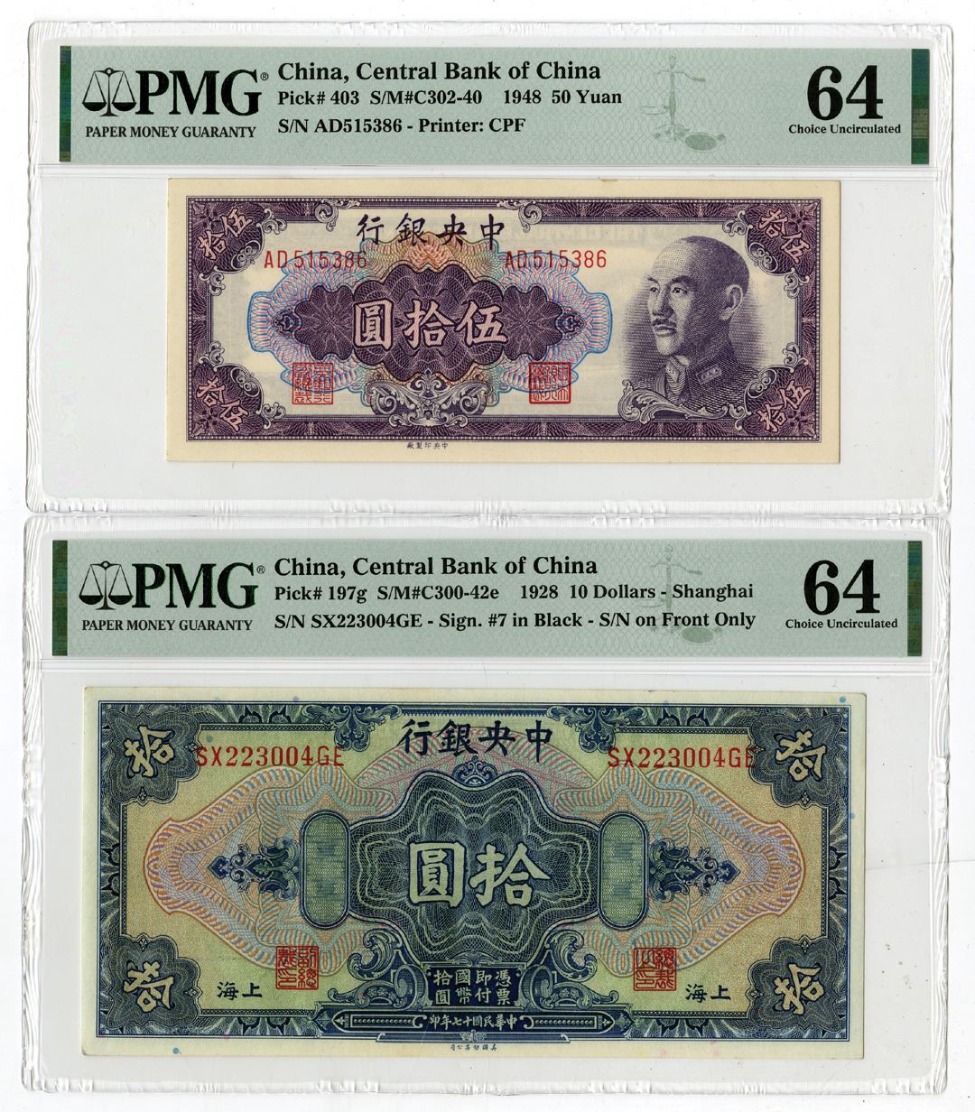 China, 1928-48. Lot of 2 Issued Banknotes, Includes: 10 Dollars, P-197g, S/M#C300-42e, Shanghai Branch, S/N SX223004GE, ABNC; and, 50 Yuan, P-403, S/M#C302-40, SN AD515386, CPF. (2). Both notes are PMG graded Choice Uncirculated 64. (2). Sold "AS IS" no returns accepted.