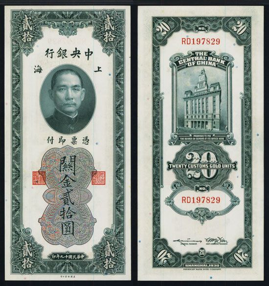 China, 1930, 20 Gold Units, P-328 S/M#C301-10, Issued banknote, Green on m/c, PMG graded Gem Uncirculated 65 EPQ, usually found XF to AU at the most due to the large size and mis-handling, Rare in high grade, ABNC.