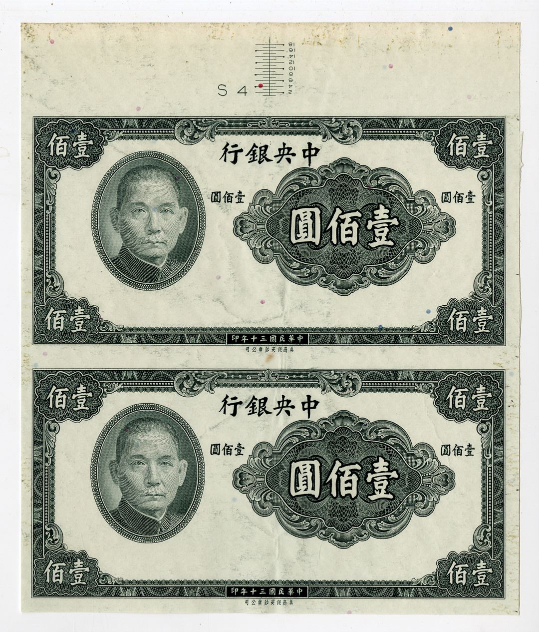 China, 1941. 100 Yuan, P-243sp, Uncut Pair of Uniface Specimen/Proof Banknotes, SYS at left, Obverse only printed, reverse blank, Greenish gray without any underprint or serial numbers, Large excess margin at top, appear uncirculated but there is a vertical fold down the middle.