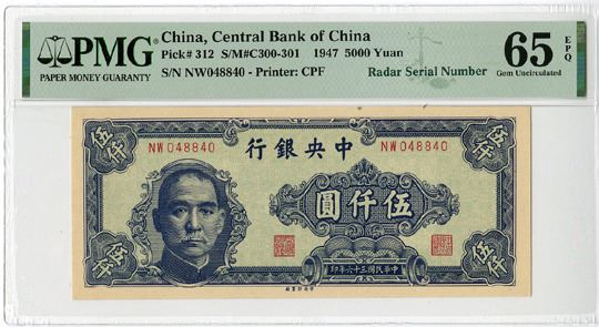 China, 1947. 5000 Yuan, P-312, S/M#300-301, Issued banknote, Blue on light green underprint, SYS at left, back green, S/N NW048840, Radar Serial Number, PMG graded Gem Uncirculated 65 EPQ. Printer: CPF.