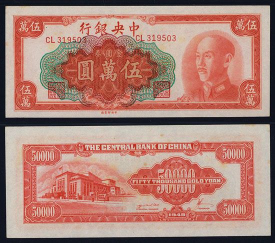 China, 1949, 50,000 Yuan, P-418 S/M#C302-62, Issued banknote, Orange on m/c, PMG graded Choice Uncirculated 64, Rare in high grade, CPF.