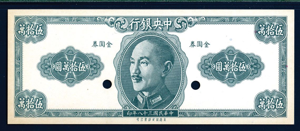 1949. 500,000 Gold Yuan, (PMG designated P-425pef), P-Unlisted. Uniface front specimen ÒPrinters EssayÓ banknote in green, CKS in center. No serial numbers, seals or series, the back with ÒApproved for Production: L-4 - Color O.K. 5.2. (19)49Ó, PMG graded Choice Uncirculated 64, Horizontal note. SBNC.