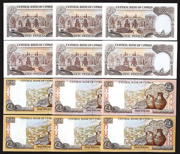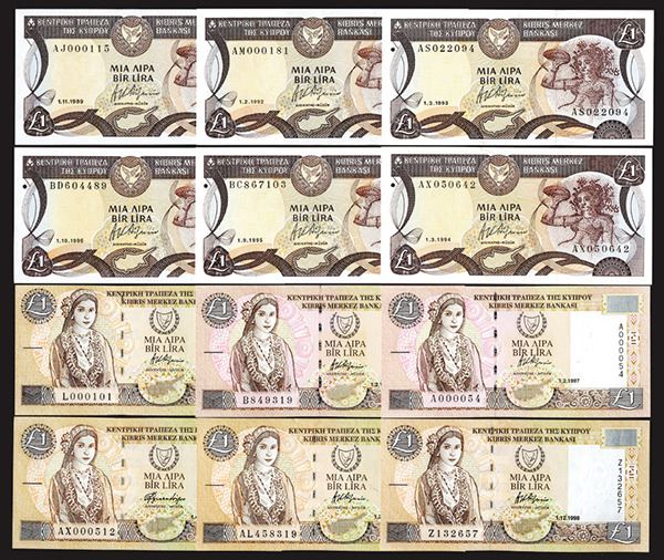 Cyprus. 1 Pound. SCWPM 53b, c, d, e. 1.11.1989 (low serial # 000115), 1.2.1992 (low serial # 000181), 1.3.1993, 1.3.1994, 1.9.1995, 1.10.1996. SCWPM 57 (2), 60a, b, c, d. 1.2.1997 (one with low serial # 000054), 1.10.1997 (low serial # 000101), 1.12.1998, 1.2.2001, 1.4.2004 (low serial # 000512). Bold embossing. All Very Choice Uncirculated or better. 12 pieces. (Arthur C. Matz Collection)