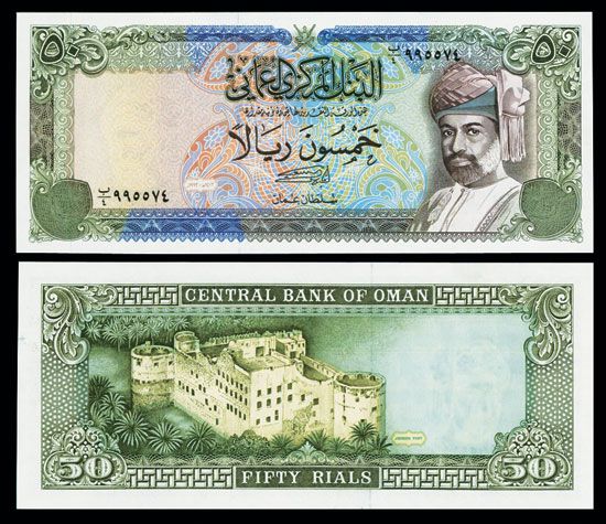 Oman, 1992, 50 Rials, P-30b, issued banknote, olive brown, blue and dark brown on m/c, Sultan on right, Lovely well centered note that appears CU but unfortunately some rough handling relegated this note to AU, S/N B/4 995574, PMG graded Choice About Uncirculated 58 EPQ, scarce and attractive note.