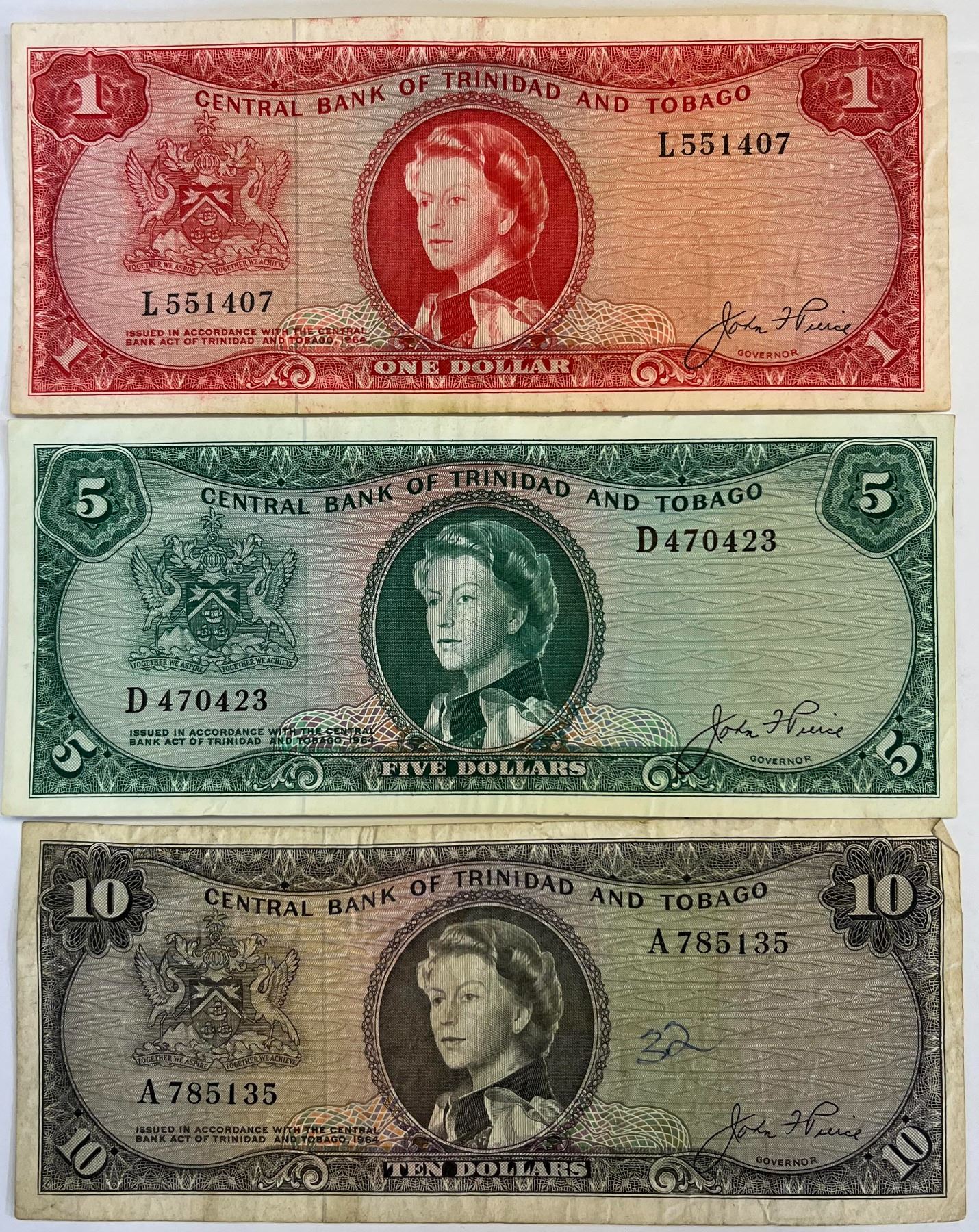 Central Bank of Trinidad & Tobago 1964 set of 3 notes. Fine to VF+.