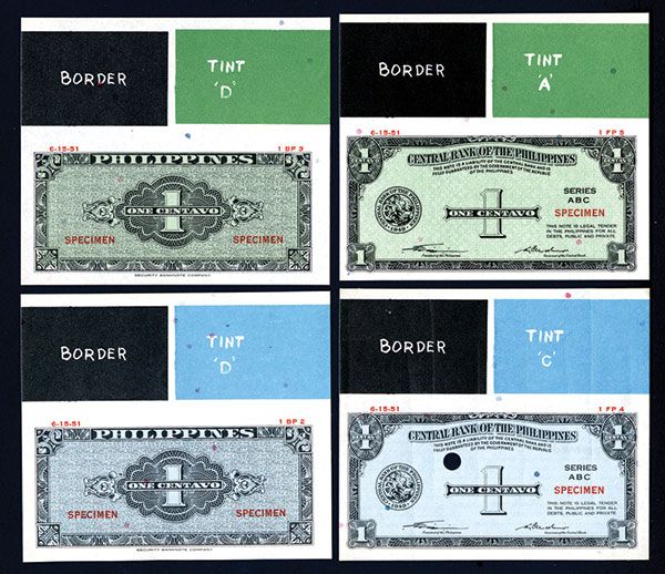 Lot of 2 notes, both uniface front and back specimens (4 pieces), All are 1 Cent issues with large printers margins on top with color bars, Red specimen overprint and “00000” serial numbers. Unreleased and unissued 1 Centavo denomination color trials. One pair is black on light blue and the second pair is black on light green, Choice uncirculated. Rare. SBNC.