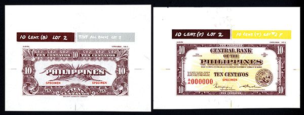 1949 (1954). P- Unlisted Essay Banknote. 10 Centavos. Uniface front and back essay specimens. Red specimen overprints and “00000” serial numbers. Large upper margin with tint blocks of border and undertints. Unreleased and unissued 10 Centavos essay color trial. 100 x 46 mm. Purple border with light yellow undertint on face and light green undertint on back. Face has a red overprint on upper top margin with date 4-28-54 and “CERO-2824 10F-2” and back has date 4-28-54 and “CERO-2824 10B-2”. Both pieces in Uncirculated to CU condition, SBNC.