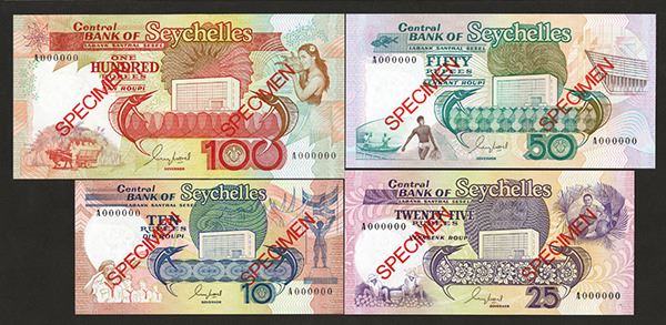 Seychelles. 10, 25, 50, 100 Rupees. P-32s; 33s; 34s; 35s. Unlisted as Specimens. Bank building at center. A000000 number on all. Red overprint SPECIMEN on both sides, matching 0310 at margin in lower left corner of the backs. All Choice to Gem Uncirculated. 4 pieces.