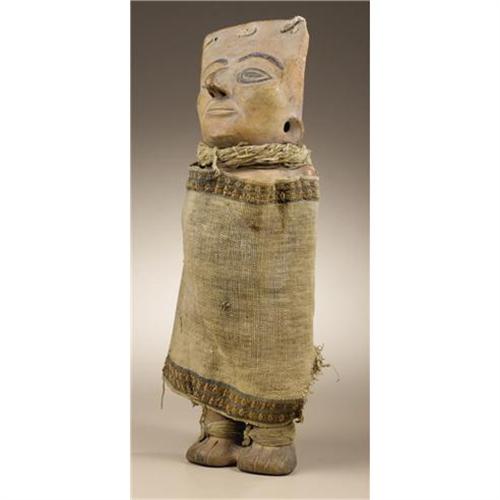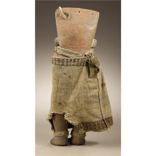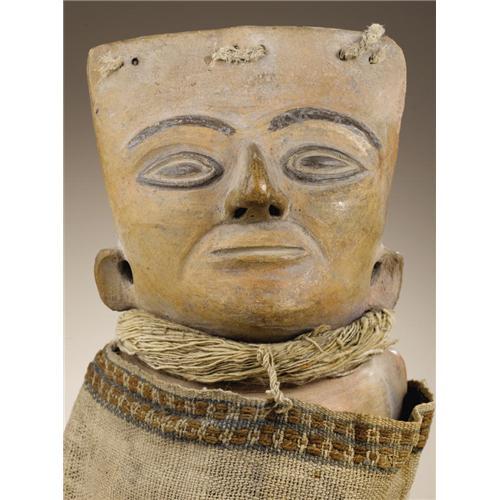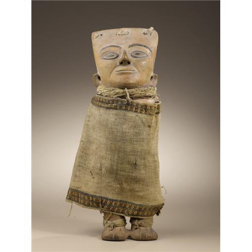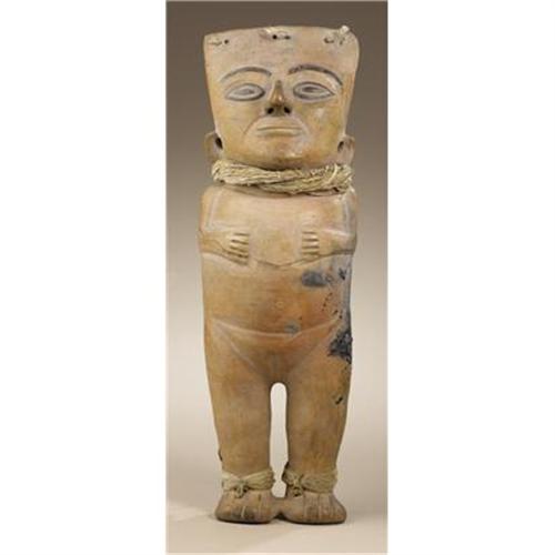 <B>Standing Female Figure</B></I><BR>Central Coast (Peru)<BR>A.D. 900 - 1400<BR>Buff ceramic; Paint; Cord wrapping; Loose weave fabric garment<BR>Height 18 7/16 in. Width 6 ½ in.<BR><BR>The plump naked female figure holds her spread hands against her chest. Her broad feet are joined at the arch by a hollow bridge. A lightly indicated navel is above a strongly indicated pubic triangle, while an incised horizontal line defines a collarbone ridge. The trapezoidal head with flattened top bears strongly modeled features, with an especially prominent aquiline nose. Relief eyebrows, eye rims, and eyes are painted black. Ear openings served as air escapes during firing. Along the top edge of the head pairs of holes, centered and at either side, still have partial cord ties remaining. A roll of slightly twisted cords is around the neck. Rolls of cord around either ankle are knotted at front. Toes and fingers are indicated by incised slashes.<BR><BR>Provenance<BR>Dave DeRoche, Piedmont, California<BR><BR>