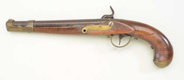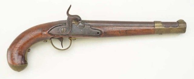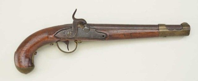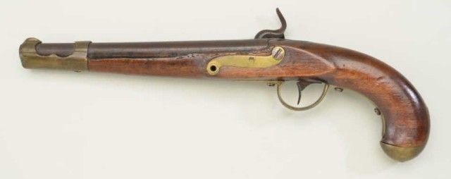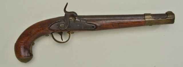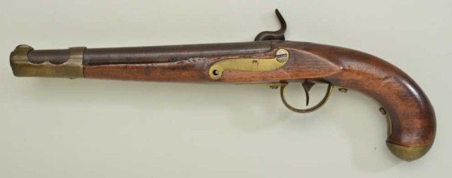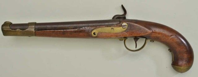 Central European Horseman's size Military pistol converted from Flintlock to percussion and Germanic in origin but no identifiable marks. The pistol measures 17" overall with 10" barrel and approx. 69 caliber smoothbore with brass mountings. The metal surfaces show a brown patina finish with some light to moderate pitting. The stocks are fair with a couple splits, losses and worming. One lock plate screw is missing,the action is not quite working properly. Est.;$300-$600.