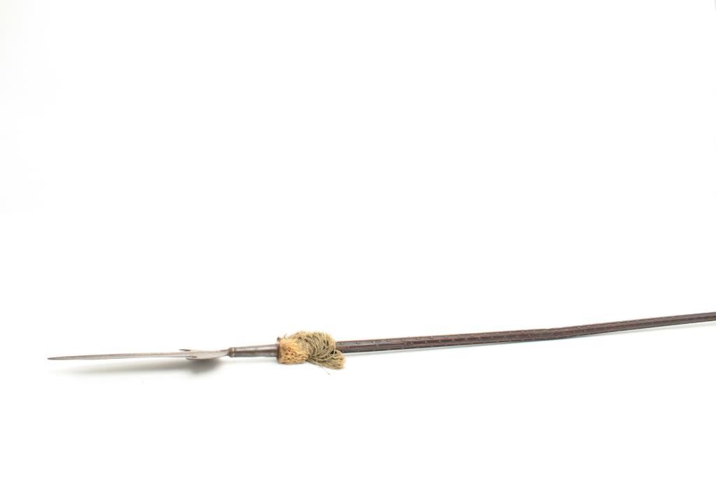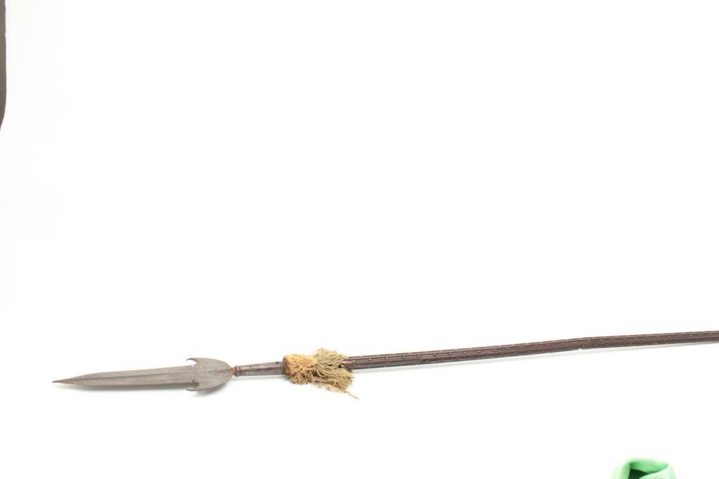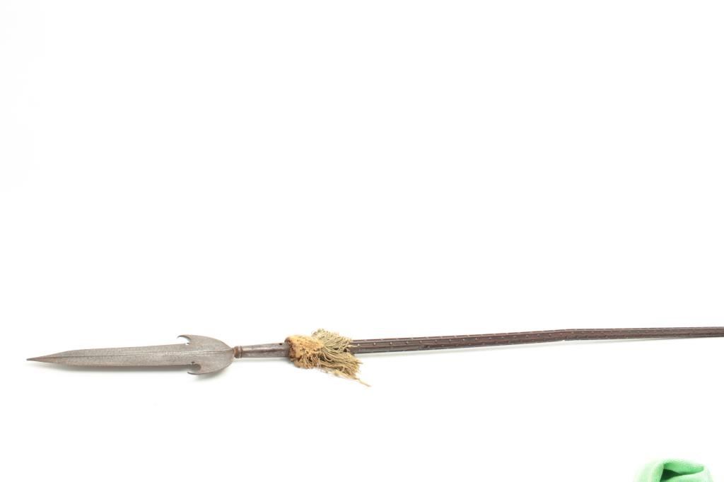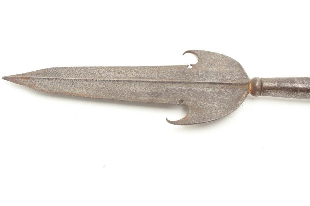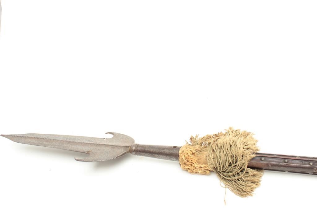 on its original fluted and studded shaft. The blade measures slightly over 18” in length and approximately 5 ¾” across the widest portion. The blade shows high quality by master armourer with raised central ridges and well executed hand forging. The shaft is carved with raised ridges and shows hundreds of studs along with over 12” reinforced tangs forged in one piece with the socket. Some light to scattered heavy pitting but very good overall and absolutely uncleaned and as found. Approximately 7’2” overall. Absolutely genuine. Est.: $1000-$2000