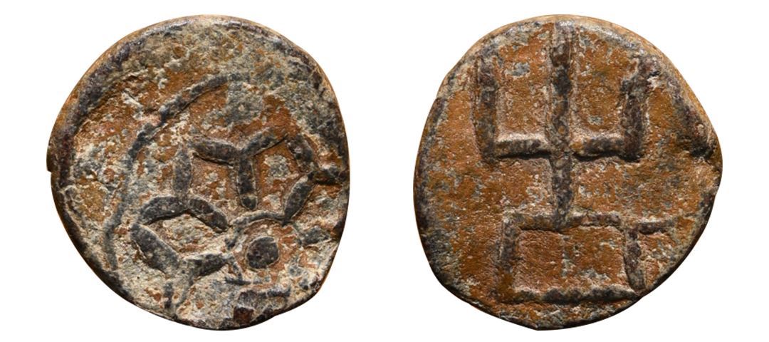 Central India, Uninscribed Local Coinage, Post Gupta, 1.01g. Copper, Obv: Flower in circle. Rev: Trident Standard.Fine, Rare.
