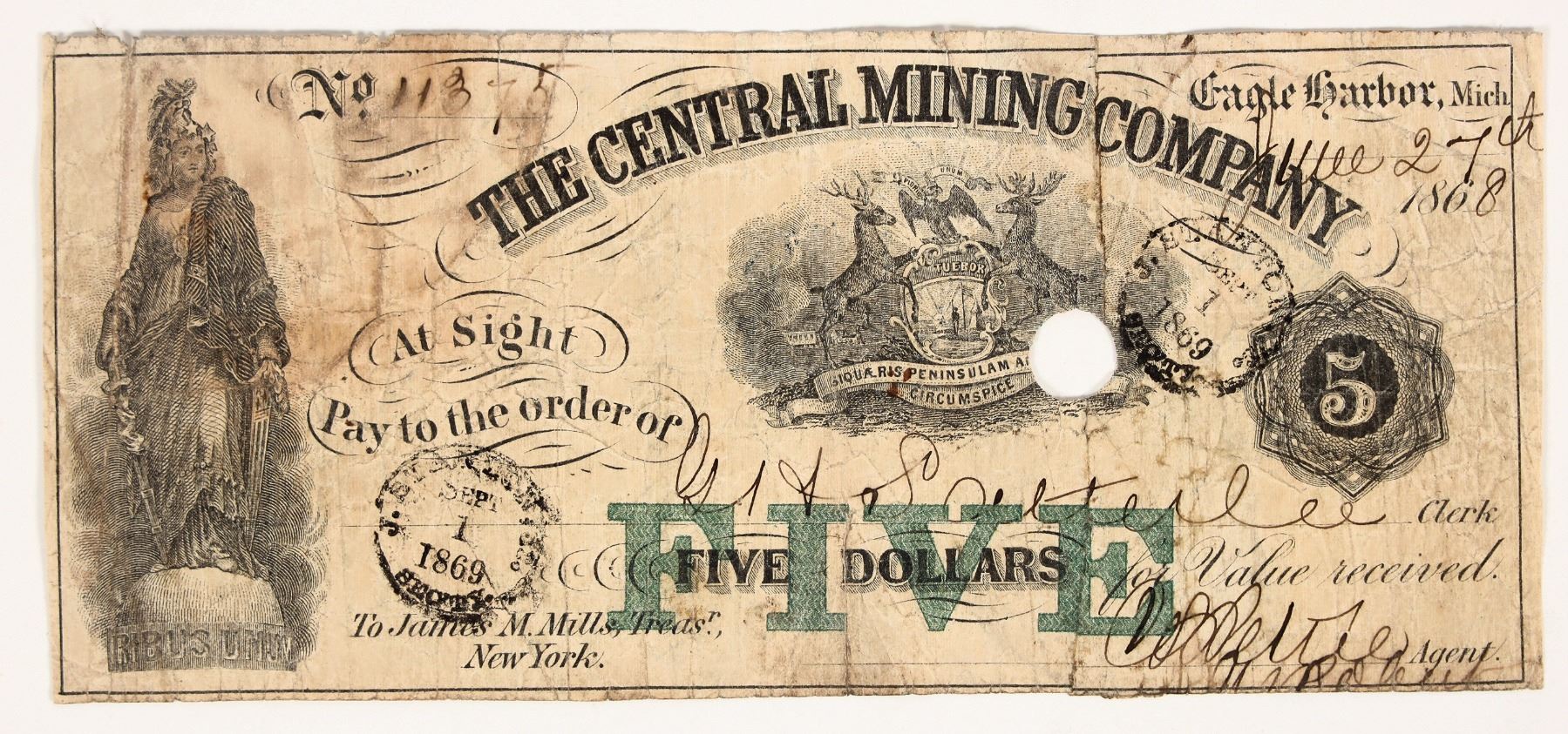 Five dollar scrip note No. 11375 issued by The Central Mining Company of Eagle Harbor Michigan 1868. Circle punch cancelled, Sept. 1, 1869. 7 x 3 inches; G-VG condition, creased.