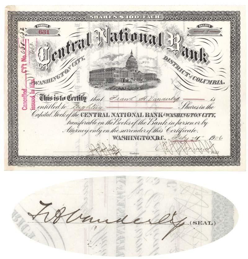 1906, District of Columbia. Stock certificate for 18 shares. Black. Vignette at center fo the Capitol Building. Issued to and signed on verso by Frank Vanderlip (1864 - 1937), bank and government official. During World War I he served as Chairman of the War Savings Committee. Working closely with James Stillman at National City Bank, Vanderlip introduced a series of important banking innoviations during the period and succeeded Stillman to the Bank's presidency upon his retirement. Very fine condition. Lightly pen cancelled, Vanderlip's signature is unaffected.