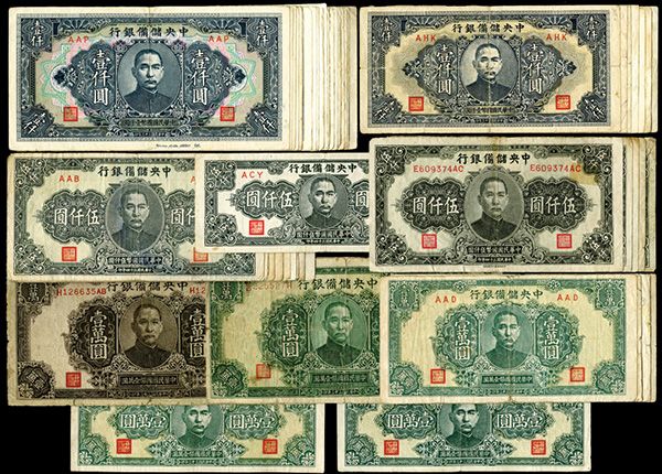 China, Lot of 50+ notes, Includes 1944 Issues, 1000 Yuan, P-J32 (20); 1000 Yuan, J-33 (7); 10,000 Yuan, P-J36, Brown (3); 10,000 Yuan, P-J37, Green (2); 10,000 Yuan, P-J38 green (4); 10,000 Yuan, P-J39, green (2); 1945 Issues, 5000 Yuan, P-J40a (5); 5000 Yuan, P-J41 (11); 5000 Yuan, P-J42 (2); Attractive and unsearched assortment for varieties and types, notes range from VG to VF-XF. Sold "As is", no returns accepted.