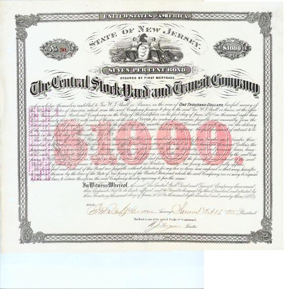 1873, New Jersey. $1000 bond bearing 7% interest. Black with red overprint. Vignette at top center of two women. Punch cancelled. Very fine.