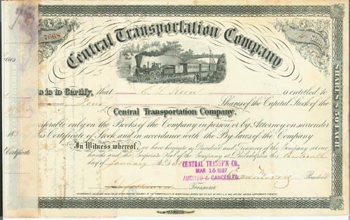 1880, Pennsylvania. Stock certificate for 4 shares. Black. Vignette of train at top center. Stamp and punch cancelled. Very fine.