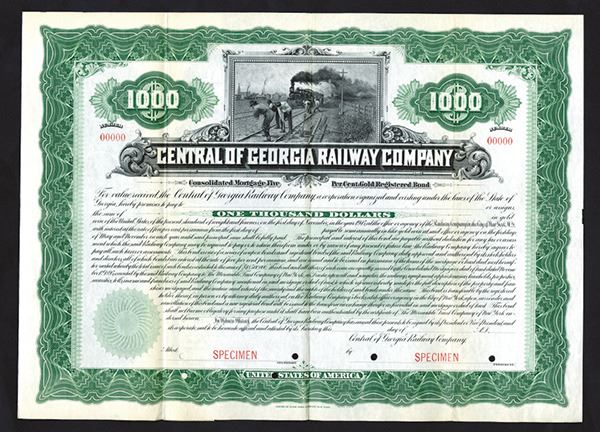 Georgia. $1000 Specimen 5% Consolidated Mortgage Gold Registered Bond, Black print on a large green border and under tint in a horizontal format, image at top of men repairing railroad tracks, Specimen overprints, POC's, VF-XF condition, ABNC.